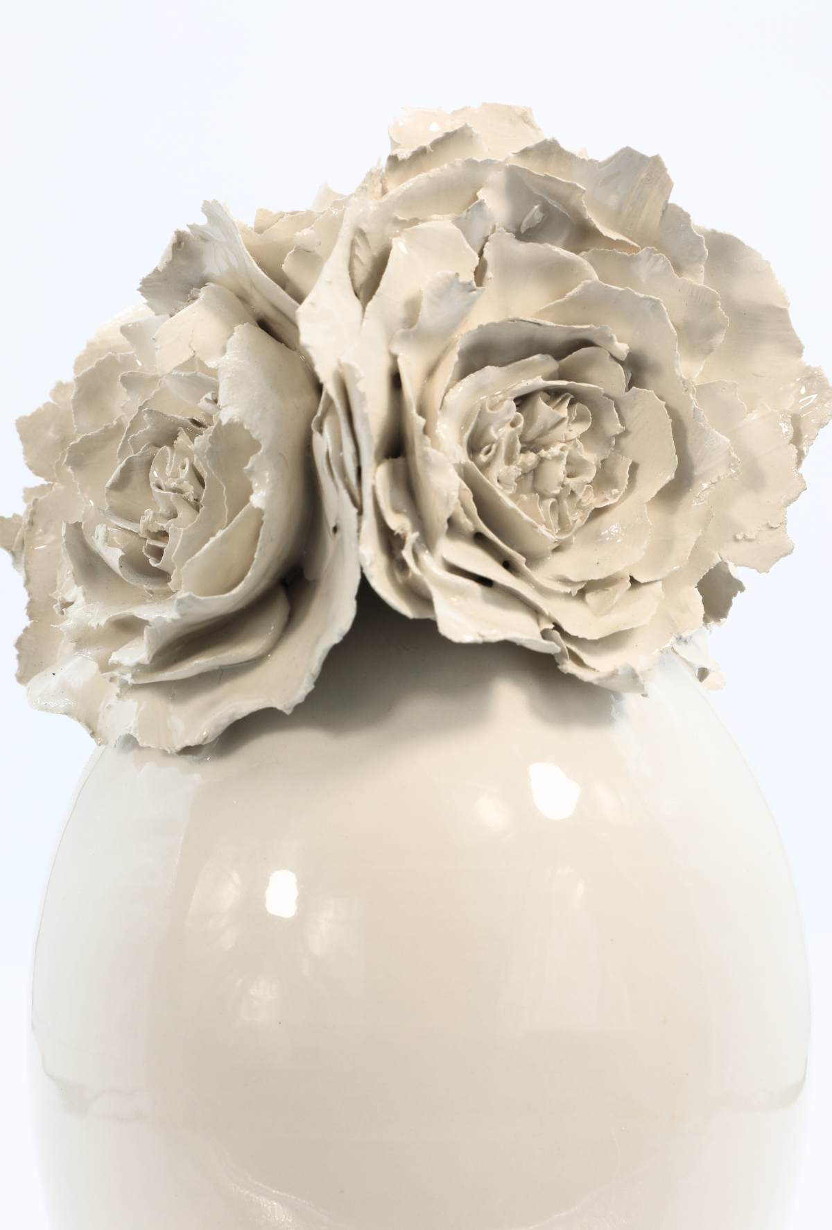 Sulla superficie dell'uovo si dipanano delicatamente i fiori di peonia, ognuno modellato a mano con estrema cura. Ogni petalo, lavorato singolarmente, contribuisce a creare un effetto visivo che cattura la fragilità e l'incantevole bellezza della natura.