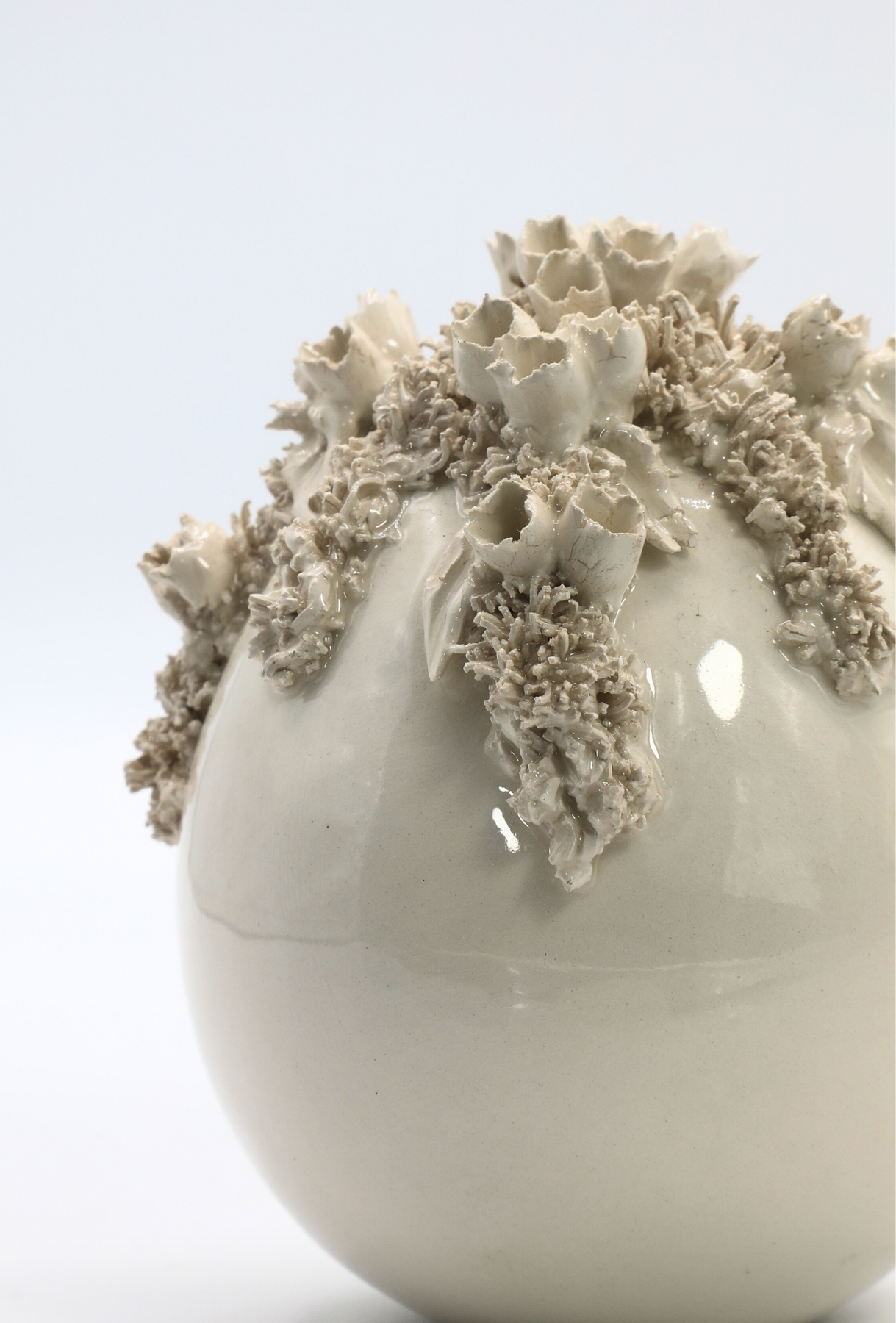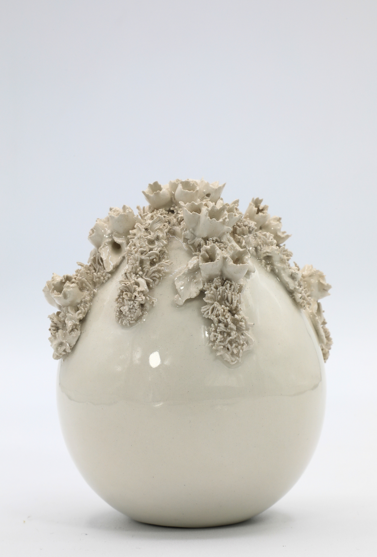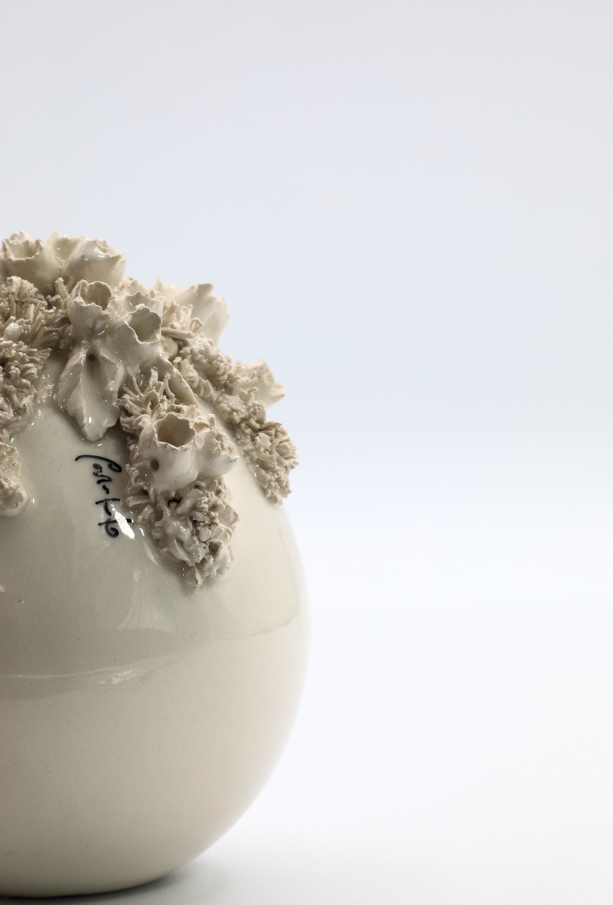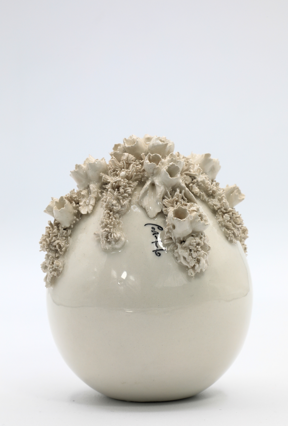 Una cascata di mughetti bianchi scende con grazia dall’apice, rivelando un’eccezionale attenzione ai dettagli. Ogni fiore, simbolo di freschezza e buon auspicio, è modellato a mano, trasmettendo un messaggio di augurio e prosperità. L’opera suggerisce di essere un portatore di buona fortuna e felicità.