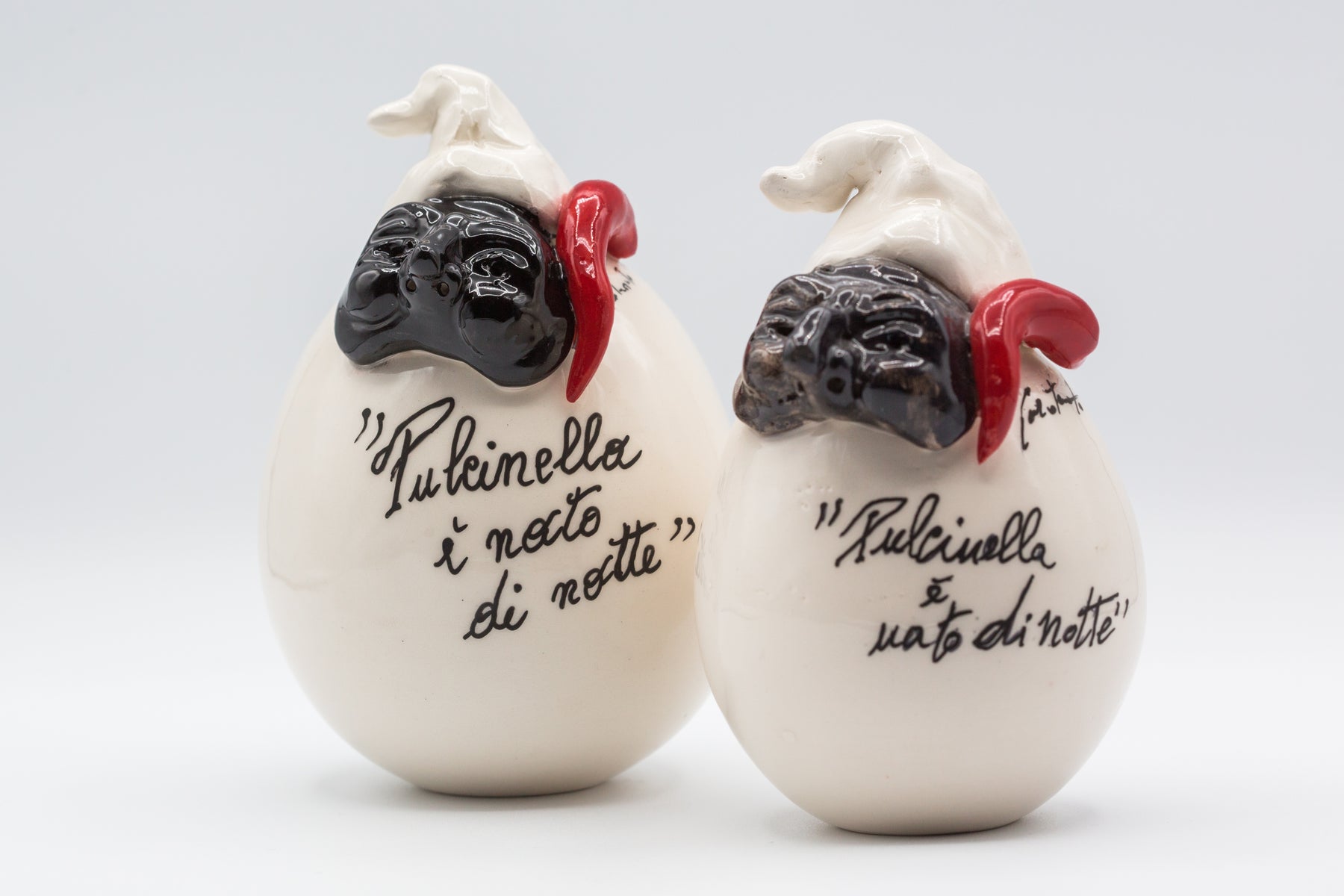Quest'uovo è un’esplosione di simbolismo e fascino: al centro della scena si trova l'uovo, simbolo universale di vita e rinascita, decorato con la maschera di Pulcinella, spirito ironico e ribelle, emblema della saggezza popolare, che ci ricorda di non prendere la vita troppo sul serio e di affrontare le sfide con spirito e umorismo.Accanto c'è il piccolo cornetto portafortuna, simbolo antico di protezione contro il male, messo sull’uovo a custodirne il segreto, proteggendolo dagli sguardi invidiosi e dalle energie negative. Fa parte della linea “Pulcinella è nato di notte”, perché la notte è il regno del silenzio, dove le maschere dormono e le idee si svegliano. È lì, tra ombra e mistero, che nasce l’ironia più autentica, dove il fragile diventa forza e ciò che è segreto trova voce. Quest’uovo è un potente simbolo di vita, gioia, protezione e resilienza. Completo di certificato artigianale, brochure esplicativa e elegante scatola avorio con logo dell’artista.
